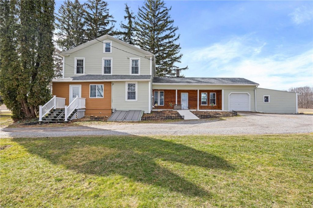 Welcome to your own peaceful country retreat, just 30 mins from Henrietta & Batavia, where over $100K in thoughtful improvements have already been completed. From the moment you arrive, you'll appreciate the new siding, added insulation, and newer windows that enhance comfort and efficiency. The beautifully updated eat-in kitchen is the heart of the home, showcasing granite countertops, new flooring, a rolling island, induction range, SS appl, pantry, and a cozy coal stove. Just off the kitchen, a sliding glass door leads to the stamped concrete patio with breathtaking views, perfect for relaxing or entertaining. Two remodeled full baths on the 1st floor highlight stylish shiplap walls, updated flooring, and modern shower stalls. The adjacent dining room, currently used as a bedroom, retains original flooring and offers flexible space. The spacious family room is warm and inviting with hardwood floors, recessed lighting, a pellet stove, and mini-split system for year-round comfort. The home includes a first-floor office, laundry area, and mudroom with basement access and exterior Bilco doors. The second floor boasts four bedrooms and an added 3rd full bath. The primary bedroom is impressively large with hardwood floors, barn door closets, and its own mini-split. Additional features include a full attic for storage, two 3-season rooms, tear-off roof, LeafFilter system (transferable warranty), and a 1.5-car attached garage with newer door. Outside, enjoy extensive landscaping with rose, lilac, and butterfly bushes, plus asparagus and red raspberry plants. Enjoy evenings around one of the two fire pits, perfect for bonfires. Ample space exists to add a future outbuilding. The home is equipped with an artesian 9' well, water softener, front water hydrant, and recently pumped septic. Side concrete walkway and covered porch complete the setting. This home blends private country living with modern updates-move-in ready.